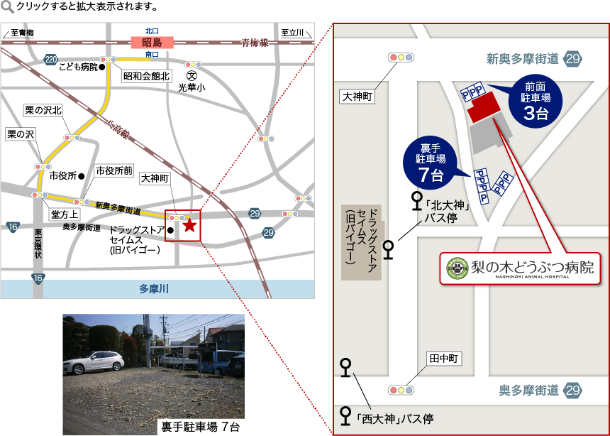 バスでのアクセス: ◎昭島駅南口から、「田中町団地」行き乗車、 「北大神」下車(乗車時間:約15分) ◎立川駅北口10番乗車口から「拝島営業所」 または「拝島駅」行き乗車 「西大神」下車(乗車時間:約25分) 「北大神」「西大神」バス停から梨の木どうぶつ病院までは徒歩1~2分です。