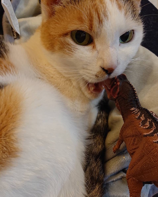 カッ!と目を見開いてギガントサウルスに食らいつくびにゃん。ティラノサウルスと並ぶ大型肉食恐竜の一属ギガントサウルスも、びにゃんには敵いませんね。