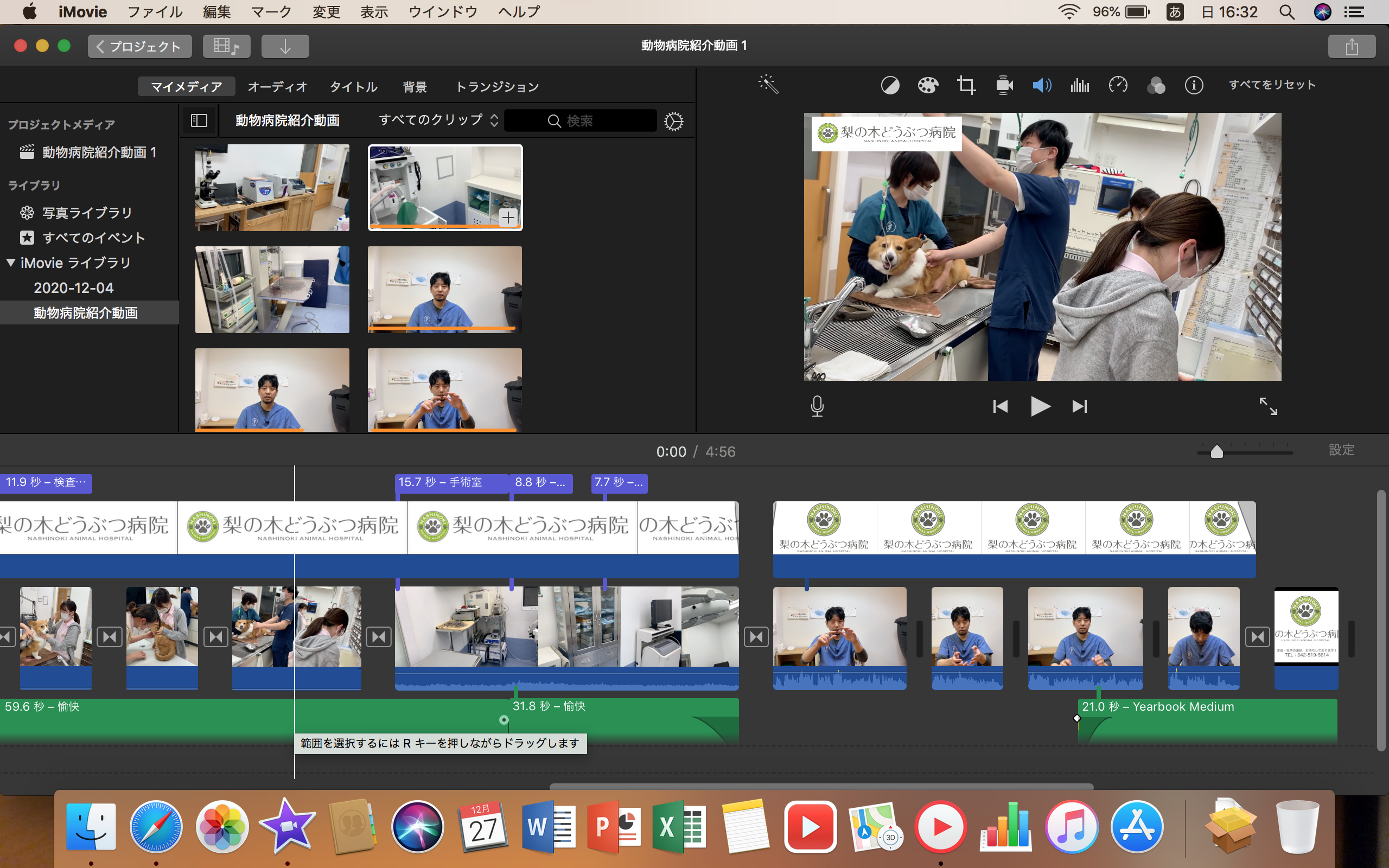 何とか動画編集が出来そうなことが分かったところで、次は動画などの素材集めです。持っているiPhoneのカメラを使って、実際に編集される病院内の動画や、病院の概要を説明した自分の自撮り動画を撮影し、Macbookに読み込ませました。