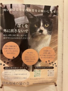 譲渡の条件は、猫が大好きで猫を幸せにできる方、100%室内飼育ができる方、最後まで責任を持って生活を共にできる方、猫に必要な医療を受けさせることができる方、60歳くらいまでの方が基本となりますが、詳しくは昭島地域の猫の会にお問い合わせください。