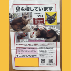 猫を探されている方から連絡がありました。ポスターを掲示しておりまうので、お心当たりのある方は、ポスター内のQRコードを読み取り飼い主様のインスタ・Xへご連絡いただくか、または梨の木どうぶつ病院までご連絡をよろしくお願いいたします。